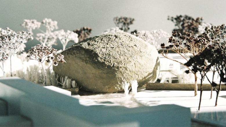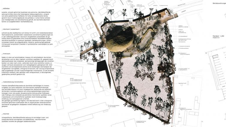 Naturraum und Außenraum | Der Stadtbach wird zu einem Biotop mit Schilf- und Weidenbestandener Flachwasserzone aufgewertet, dessen Wasserstand pulsiert. Birkenneupflanzungen ergänzen diesen Raum. In diesen selbstregulierenden Naturraum sind Außenbäder als gehöhlte Steine eingebettet, die eine unverwechselbare Naturbadatmosphäre garantieren. Alle Baukörper im Parkraum, wie das Parkdeck, die Betriebswohnungen und die Außenumkleiden, sind aufgeständerte, hölzerne, pavillonartige Gebäude mit bewusst temporärem Charakter, die in einem symbiotischen Wechselspiel zur Parkatmosphäre stehen.