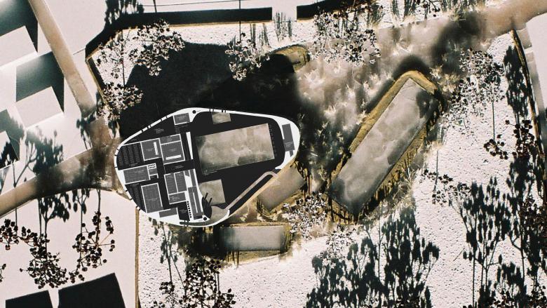 Städtebau | Ein autarker, amorph geformter Baukörper stellt eine autonome und identitätsstiftende Setzung inmitten einer eher heterogenen Bebauungsstruktur dar. Er wird von einer parkähnlichen Freifläche mit hoher atmosphärischer Dichte umspült, die durch Funktionsgebäude wie ein Parkdeck gerahmt wird. Diese Gebäude sind in einen feinen Schleier aus Metallgewebe und Naturberankung gehüllt und bilden räumliche Abschlusskanten zur ausgeblendeten Nachbarbebauung.