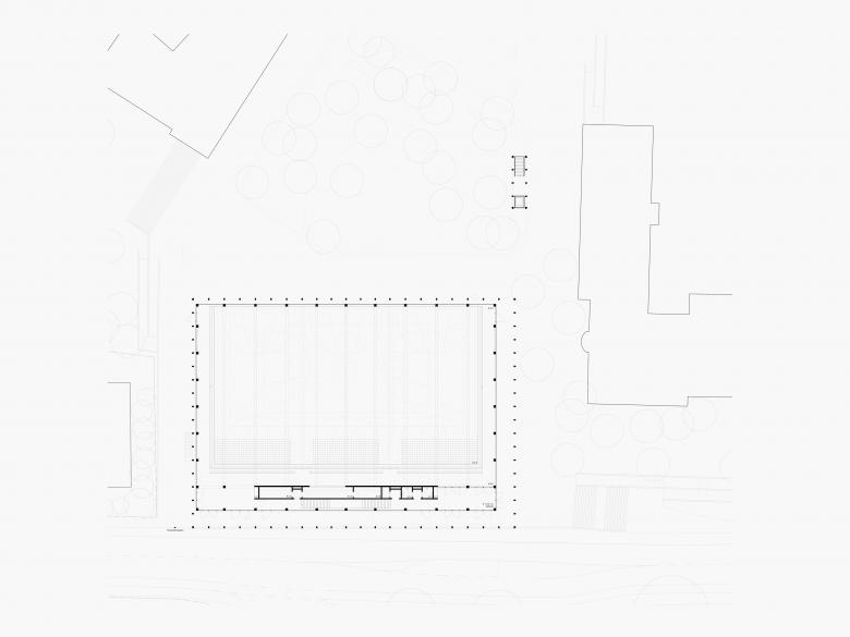 Als Reminiszenz an historische, städtische Gebäude mit steinernen Wänden und einem hölzernen Dachstuhl tritt der Baukörper als steinerne Stützenstruktur, die sich aus dem steinernen Sockel der Hofsituation in die Höhe entwickelt, in Erscheinung. Darin asymmetrisch eingelegt, bildet eine aufgelöste, hölzerne Stützen- und Tragwerksstruktur den Rahmen der „Glasvitrine“, der Sporthalle. Auf der Ost- und Westseite, den Bezugsseiten zum städtischen Außenraum, löst sich die steinerne Stützenstruktur deutlich vom der Glasvitrine ab, eine Arkadenstruktur entsteht. Im Lastfall der öffentlichen Nutzung artikuliert sich der Baukörper als transparentes Bauwerk, der gezielt die Bezüge zum Stadtraum auf der Ostseite, dem Stra- ßenraum der Lindauer Straße, dem Birkensteig auf der Südseite sowie des Binnenraums auf der Nordseite sucht und beide Bereiche visuell in Verbindung setzt. Im Lastfall des Schulbetriebs kann durch Herablassen des Sichtschutzes, der gleichzeitig auch als Sonnenschutz dient, der Charakter, weg vom transparenten, hin zum geschlossen, introvertierten Bauwerk gewandelt werden. In Analogie zur Position der Glasvitrine im steinernen Stützensystem, weist auch das Spielfeld selbst eine asymmetrische Lage im Baukörper auf. Dadurch wird eine dreiseitige Einblicksituation von der Zuschauerebene aus geschaffen, gleichzeitig aber auch der direkte Bezug zum Zentralhof gestärkt. Funktionale Notwendigkeiten auf der Zuschauerebene, wie die Küche, die Theke und barrierefreie WCs, werden gebündelt und treten in Form eines steinernen Blocks als „Rückgrat“ der Sporthalle in Erscheinung, welcher gleichzeitig die räumliche Trennung zur Erschießung der Sportlerebene formuliert. Die Umkleiden im Untergeschoss werden über einen Zentralgang in Ost-Westrichtung erschlossen.