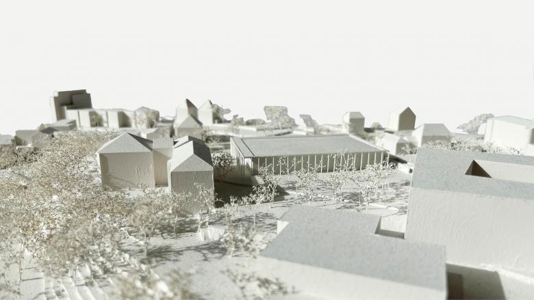 Die Stellung im Stadtraum | Aufgrund ihres Selbstverständnisses als öffentlicher Baukörper positioniert sich die Sport- halle, auf einem Sockel liegend, selbstbewusst im Straßenraum der Lindauer Straße. Da- durch wird sowohl eine Präsenz im Stadtraum erzeugt, als auch die Lesbarkeit der da- hinterliegenden Struktur, der Schule, vom Straßenraum aus gestärkt. Außenräumlich wird eine wechselseitige Adressbildung zwischen Schule und Stadt- baukörper, innenräumlich eine Blickbeziehung zum städtischen Raum, ein „Fenster zur Stadt“, erreicht. Um diesen deutlichen Mehrwert zu generieren, wird von der in der Aus- lobung geforderten Position im Grünraum zwischen Lindauer- und Reichlinstraße Abstand genommen. Vielmehr werden die Großbaumassen, die als schwimmende Baukörper in einem übergeordneten Parkraumkonzept definiert werden, gezielt in Beziehung zueinander gesetzt. Eine Abfolge dreier topografisch gestaffelter Hofräume entsteht, die in den bestehenden östlichen Grünraum münden. Dieser wird in Folge als naturnaher Parkraum, sowohl für die Bevölkerung, als auch für die Schule, ebenfalls als öffentlicher Raum aufgefasst, zu- gänglich gemacht und aktiviert. Ein deutlicher Mehrwert für die umliegenden Bewohner, aber auch für die ganze Stadt entsteht.