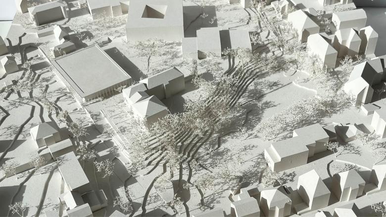 Das Schulgebäude, die neue Sporthalle und das Mädchenpensionat bilden den baulichen Rahmen der entstehenden Hofsequenz „Eingangshof“, „Zentralhof“, „Balkon zum Park“. Dabei bietet jeder der Räume eine unterschliedliche Raumqualität, sowie eine unter- schliedliche Gewichtung der Bespielung durch die Nutzer. Der Eingangshof dient dabei vor allem der Erschließung und Verknüpfung der Schul- eingänge. Der Zentralhof ist sowohl Pausenhof für die Schule, Freibereich der Mensa, Knotenpunkt der Erschließung des Areals, aber auch eine multifunktional nutzbare Fläche für unterschiedliche Bespielungen, wie schulische Theatervorführungen oder Feste. Der Balkon zum Park stellt einerseits eine grünraumnahe Verweil- und Ausblicksituation dar, andererseits dient er als rückseitig angelagerte Infrastrukturfläche zu den Bespielungsszenarien des Parks. Die Bepflanzung im urbanen Bereich folgt einem artifiziellen Muster. Eine radiale angeord- nete Setzung bietet eine Variabilität der Funktionen und gleichzeitig aufgrund der klaren Ab- stände auch eine Lesbarkeit im Raum. Dadurch lassen sich gegebenen Funktionen an den urbanen Raum besser anpassen ohne vom strikten Raster der Radien abzuweichen. Zudem entsteht durch diese Anordnung ein differenziertes Spektrum aus einem dichtstehenden hochstämmigen Baumhain im Zentrum und vereinzelten Solitärgehölzen, welche sich nach außen hin immer transparenter zerstreuen und mehr Überschaubarkeit gewähren.
