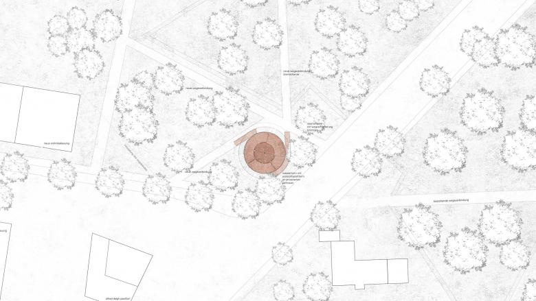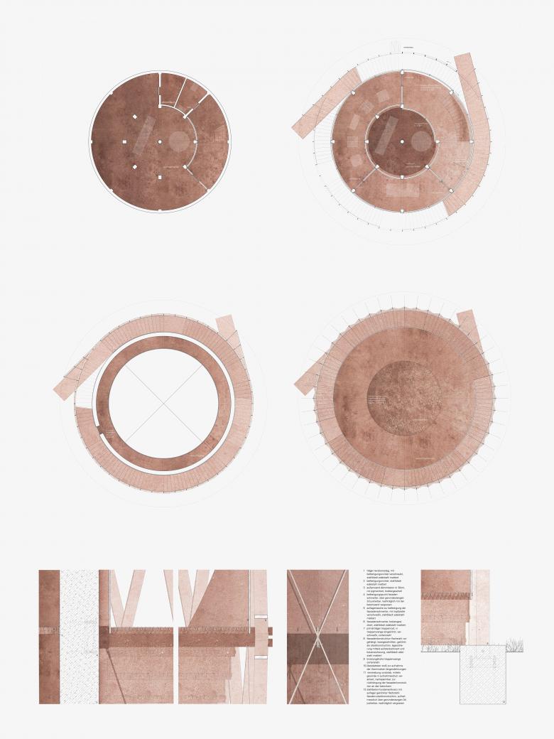 Die Grundrisskonzeption folgt der radialen Struktur eines aufgeschnittenen Baumstammes. Den Kern bildet hierbei der Edelstahl-Wassertank mit einem Fassungsvermögen von 1700m3. Umlaufend ordnen sich Revisionsstege an, die über ein Leitersystem erreichbar sind. Unterhalb des Tanks, auf Erdgeschossniveau, befindet sich die Schaltwarte, die nötige Schleuse, die Revisionstore und das Notstromaggregat. Im Untergeschoss, über einen luftraum von der Schaltwarte aus einsehbar, befindet sich der Pumpenkeller samt wc. Den Betonkern umschließend ordnet sich im Außenbereich ein Treppensystem an, das als Aufgang zur überdachten Aussichtsplattform fungiert. Dort sammelt sich in einer Mulde im Boden Regenwasser, welches nur langsam verdunstet und erneut das Thema Wasser inszeniert.