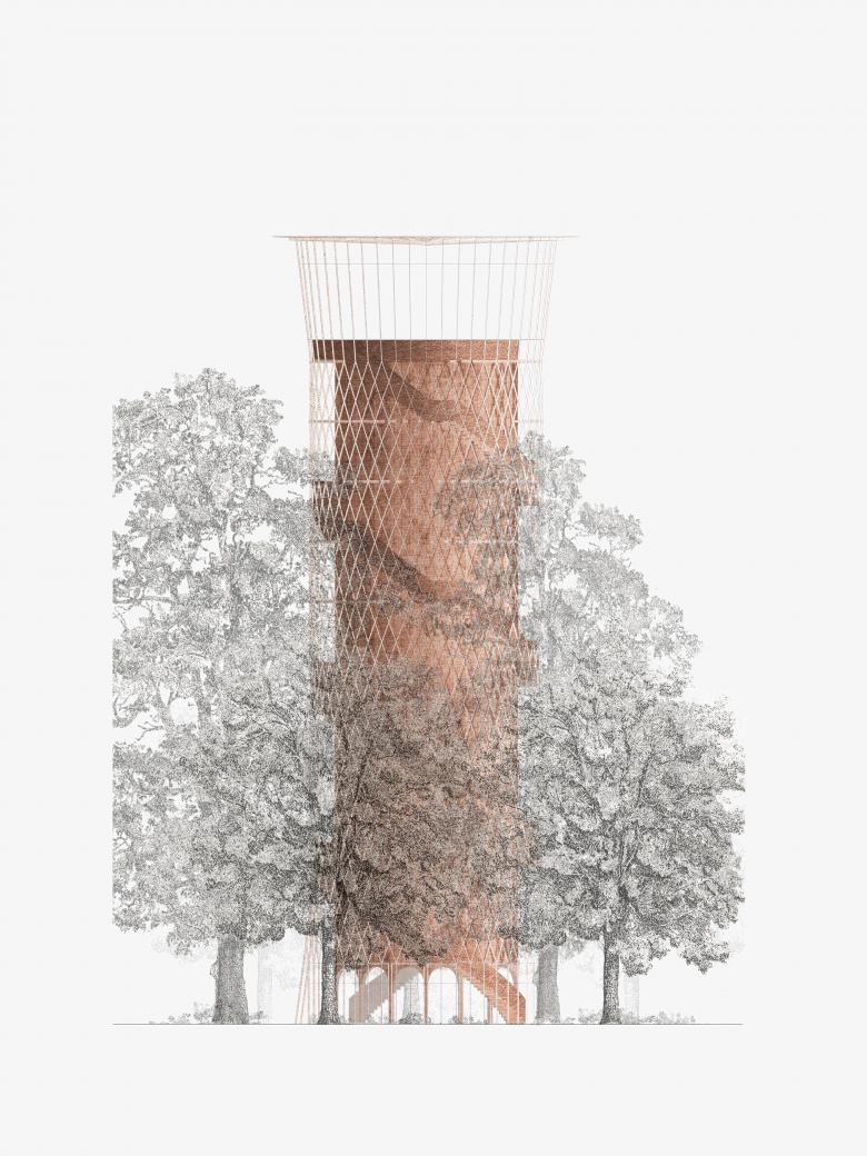 Aufgrund seines Selbstverständnisses als Teil des Parkraums bezieht sich der Wasserturm in seiner Ausformulierung auf die Struktur eines baumes. Ein Aufgeständerter Kern aus monolithischem, brettergeschalten Dämmbeton bildet die Grundstruktur, an die ein sich verzahnendes Flachstahlgeflecht angehängt wird. Dieses dient gleichzeitig als Auflager für die Stahlwangentreppen sowie für das Dach der Aussichtsterrasse. Dabei schafft der Betonkörper eine Analogie zur Dichte des Blattwerks. Zusätzlich spielt die eigene, rote Tonalität des Bauwerks mit den jahreszeitlich wechselnden Farbigkeiten der umliegenden Bäume. Die erdgeschossige Aufständerung samt Verglasung dient einerseits dem Einblick in die Wassertechnik, andererseits erzeugt sie eine Verwandtschaft zur Erscheinung einer Baumgruppe mit ihrer Durchlässigkeit unterhalb des Astansatzes. Das Flachstahlgeflecht mit zahlreichen gesteckten Verzweigungspunkten hingegen übersetzt abstrakt das Bild von Aststrukturen.
