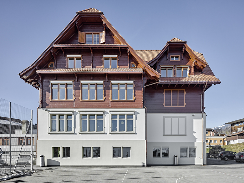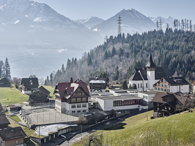 Das 1967 erbaute Schulhaus 2 mit Turnhalle, die 1976 erweiterte Pfarrkirche Schwendi und das ehem. Hotel/Kurhaus Stalden aus den 70er Jahren entstanden allesamt nach Plänen von Paul Dillier. Mit der Restaurierung des 1911 fertiggestellten und 1930 erweiterten Schulhauses 1 schliesst sich somit für das Büro gewissermassen der Kreis des Ortskerns Stalden. Das Schulhaus wurde nach denkmalpflegerischen Grundsätzen restauriert und an die aktuellen Anfroderungendes Schulsystems angepasst.