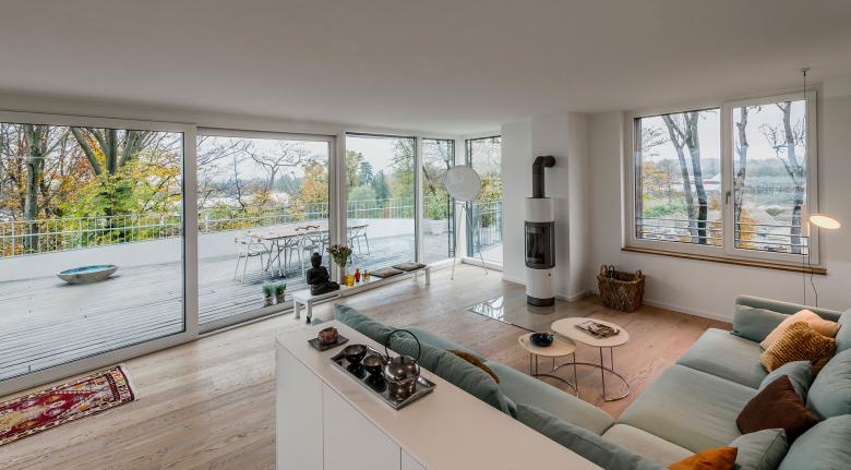 Each arm of the Y-buildings, which are all accessed from the north, contains an apartment which is linked to the core while providing a maximum of flexibility. The north- and east-facing bedrooms benefit from indirect light, while the kitchen and studies are orientated towards the south and west, capturing the light during the day and of the evening sun. In terms of the number, size and precise position of individual rooms, the apartments were designed in keeping with the user’s wishes. At the extreme end of the Y-arm, the living room opens out with floor-to-ceiling glazing and a large balcony overlooking the park, creating the impression of being immersed in nature.