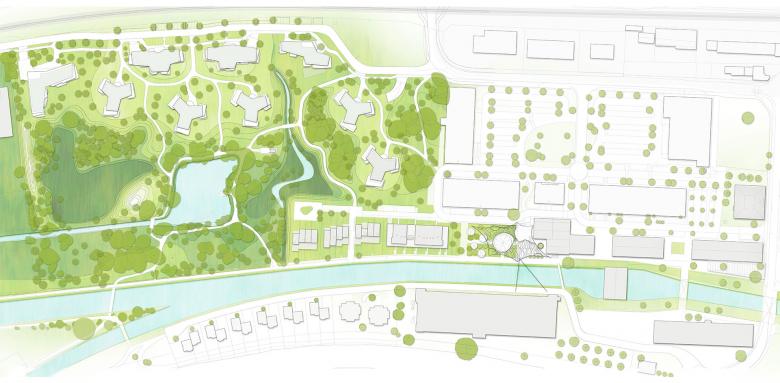 The listed buildings of the Alte Spinnerei (Old Spinnery) in the center of Kolbermoor have been transformed into a popular destination. The Spinnereipark which forms part of the historic ensemble north of the canal has been revitalized and upgraded. The area in the south is available to the public for recreational activities. In the northern part, an urban planning scheme was developed featuring two different building typologies for residential use: the five Y-houses and four Conradty-houses, as they are called. The buildings carefully insert themselves into the shifting topographic pattern of the park landscape which runs between the buildings, allowing the zoning of more private and more public spheres.