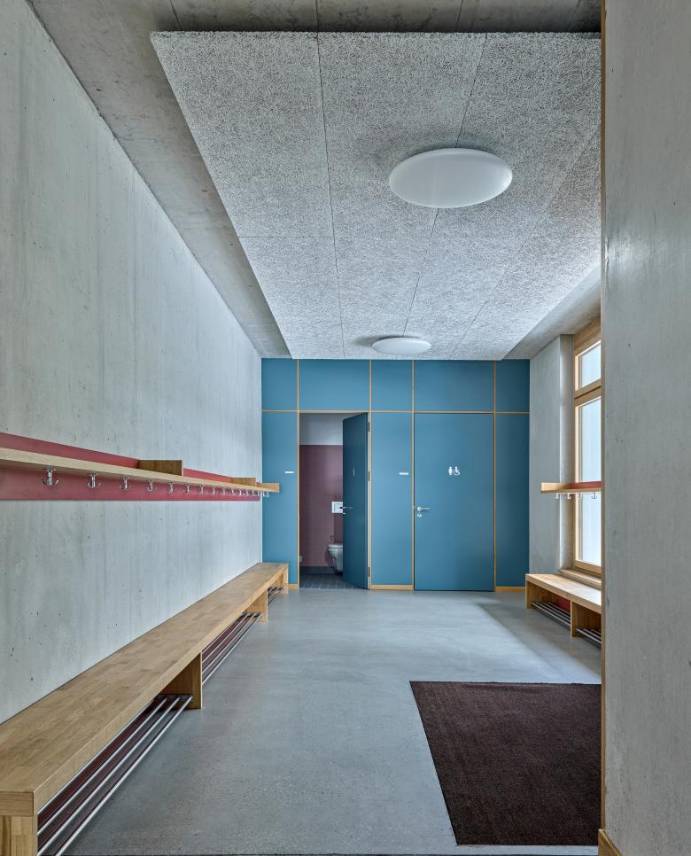 Das ehemalige Wohngebäude an der Eugen Huber-Strasse wird durch einen Neubau mit grösserer Ausnützung ersetzt. In einem Dreispänner entstehen elf Wohnungen für die Baugenossenschaft Alpenblick, im Erdgeschoss wird nebst dem Genossenschaftsbüro ein städtischer Kindergarten erstellt. Der Neubau reiht sich in die bestehende Bebauungsstruktur der Baugenossenschaft Alpenblick ein, deren Bauten quer zur Eugen Huber-Strasse liegen. Gleichzeitig übernimmt er die bestehenden Gebäudeabstände und bindet sich ans Wegnetz der Siedlung. Auf der Südseite des Hauses befindet sich der Spielplatz des Kindergartens, der mit der vorstehenden Balkonschicht einen grosszügig überdachten Aussenraum erhält. Sämtliche Wohnungen sind zwei- bis dreiseitig orientiert, kompakt geschnitten und besitzen gut proportionierte und möblierbare Zimmer. Die Wohnungen sind geprägt durch natürliche, robuste und nachhaltige Materialien wie Eichenparkett, Holzmetallfenster und lasierte Sichtbetondecken. Das Gebäude besitzt eine Putzfassade mit differenziertem Modellierputz, welcher entlang der Balkone und in den Attikaeinschnitten durch gewellte Faserzementplatten ergänzt wird. Der Neubau lotet im Sinne einer massvollen Verdichtung in der Siedlungsfläche den baurechtlichen Gestaltungsspielraum aus und bettet sich gleichzeitig rücksichtsvoll ins Quartier ein.