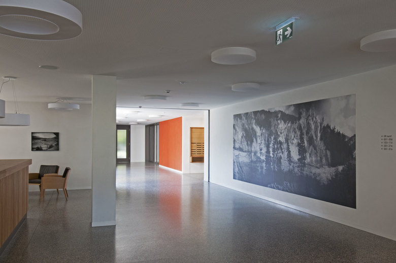 In den Obergeschossen sind alle Abteilungen direkt und barrierefrei mit dem Neubau verbunden, wodurch die Bewohner Bewegungsfreiheit auf dem gesamten Geschoss haben. Der Neubau wird mittels zentral angeordnetem Lift- und Treppenkern erschlossen. Ein weiterer freistehender Kern mit Nebenräumen sorgt in Verbindung mit dem Erschliessungskern für einen fliessenden Raum, welcher durch Nischen rhythmisiert wird. Hierdurch wurden verschiedene Aufenthaltssituationen geschaffen. Die einladende Erschliessungs- und Kommunikationszone mündet in den grosszügigen Aufenthaltsraum mit vorgelagerter Loggia, der Aussichten in die Weite der Landschaft freigibt.