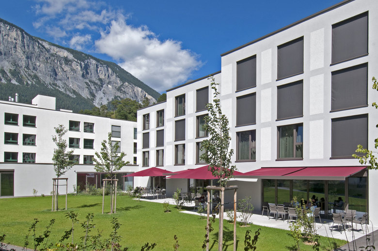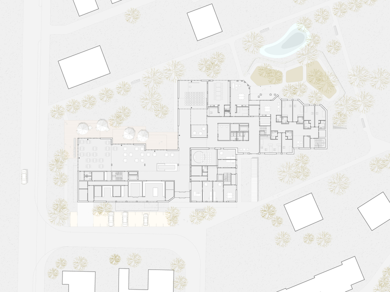 Auf Erdgeschossebene profitieren die im Neubau platzierten öffentlichen Bereiche wie Cafeteria, Speisesaal und Mehrzweckraum von der Mittag- und Abendsonne.