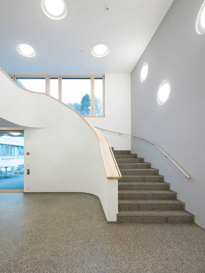 Die Ausrichtung der Erweiterung parallel zum Hang ermöglicht zwei ebenerdige Zugänge: hangseits der Hauptzugang für Besucher und Mitarbeiter, bergseits der Ausgang in den Garten. Eine grosszügige Treppenanlage verbindet das Verwaltungs- und Therapiegeschoss mit der Cafeteria im ersten Obergeschoss.