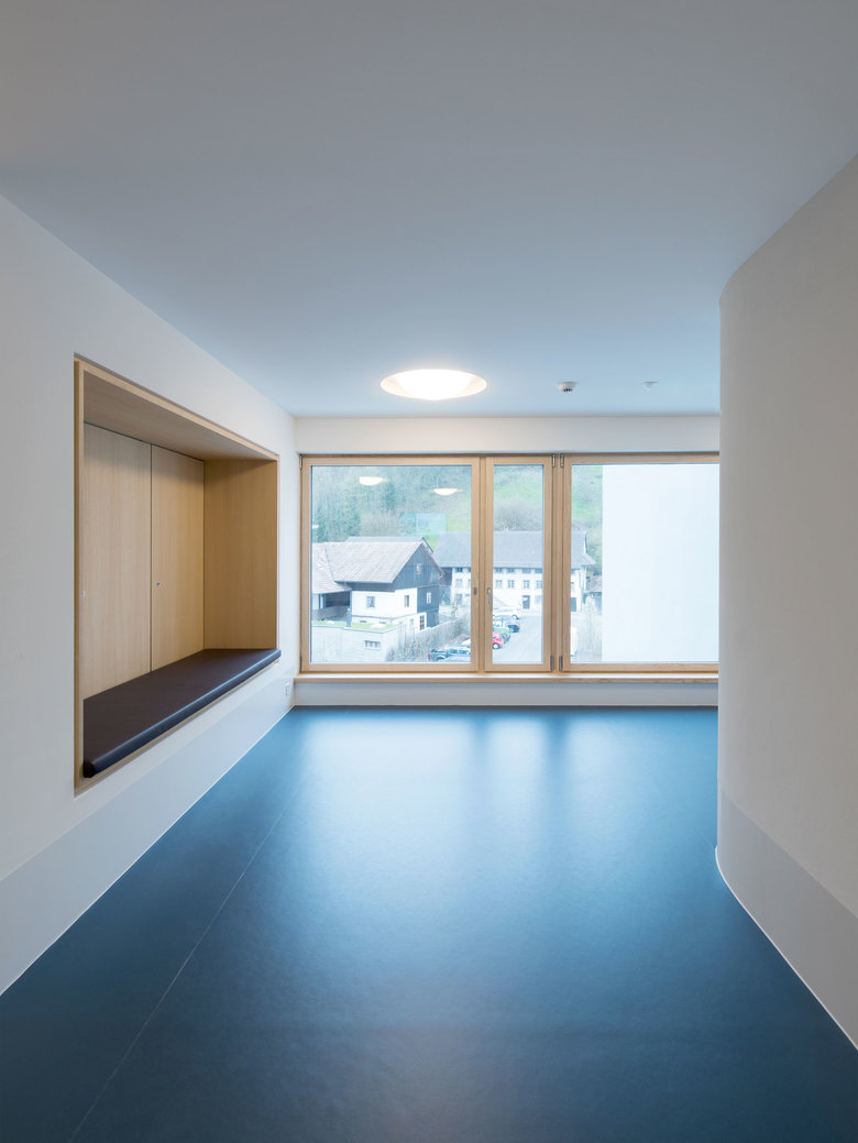 Die Fassade des neuen Gebäudes nimmt Themen des Bestandes und Bauelemente der landwirtschaftlich geprägten Häuser der Umgebung auf: Der mineralische Steinputz erinnert spielerisch an den Betonsockel des Altbaus. Der starke Kontrast von hellem Sockel- und dunklem Fassadenputz stellt einen Bezug zu den hellen Putzwänden und den dunklen Holzverschalungen der umgebenden Bauten her. Grossformatige, regelmässig angeordnete Fensteröffnungen schaffen einen selbstverständlichen Übergang zum Bestand. In Analogie an den Sonnenschutz von Hotelbauten runden rote Markisen das Bild ab. Im Innern schaffen naturbelassene Esche-Einbauten, Linoleumbeläge und gefilzte Putzflächen eine wohnliche Atmosphäre.