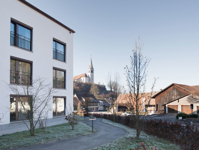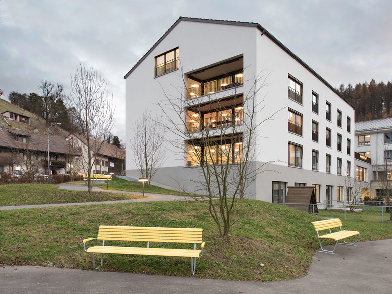 Das Pflegeheim liegt am Fusse eines Hügels, am Rande des alten Dorfkerns von Würenlingen. Der Erweiterungsbau bildet zusammen mit dem Bestand aus den 1980er-Jahren ein L-förmiges Ensemble und gliedert die Aussenräume neu. Der ehemals introvertierte Südbereich der Anlage öffnet sich neu zu Strasse und Dorf. Folgerichtig wurde der Hauptzugang hierhin verlegt, an die Nahtstelle zwischen Alt und Neu. Ein grosszügiger Garten, der mit Obstbäumen, Blumenbeeten und Holzbänken an einen traditionellen Bauerngarten erinnert, umgibt Alt- und Neubau und schafft ein neues Ganzes.