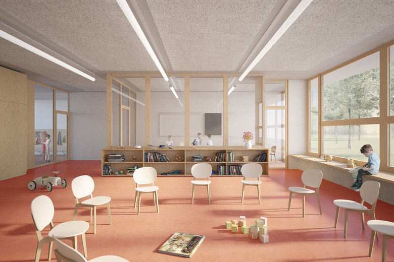 Die Nuzungsverteilung wird im Vergleich zum bestehenden Unterstufenschulhaus gespiegelt. Die öffentlichen bzw. allgemeinen Räume der Schulanlage wie die Tagesstruktur, der Singsaal sowie die Bibliothek bilden den Kopf des Gebäudes respektive das Scharnier zwischen der Unter- und der Mittelstufe. Die Klassenzimmer sind alle nach Süden zum ruhigen Grünraum orientiert. Die Räume des Kindergartens befinden sich im Erdgeschoss mit direktem Zugang zum Aussenraum.