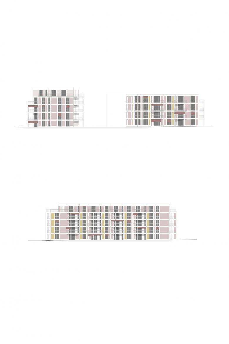 Die fünfgeschossige Zeile beherbergt 28 Wohnungen, welche über 2 Treppenhäuser erschlossen werden. Die Eckwohnungen wie auch die innenliegenden Ost-West-Wohnungen profitieren von mehreren Ausrichtungen und erhalten durch die gestaffelte Fassade eine zusätzliche Orientierung und Besonnung gegen Süden.