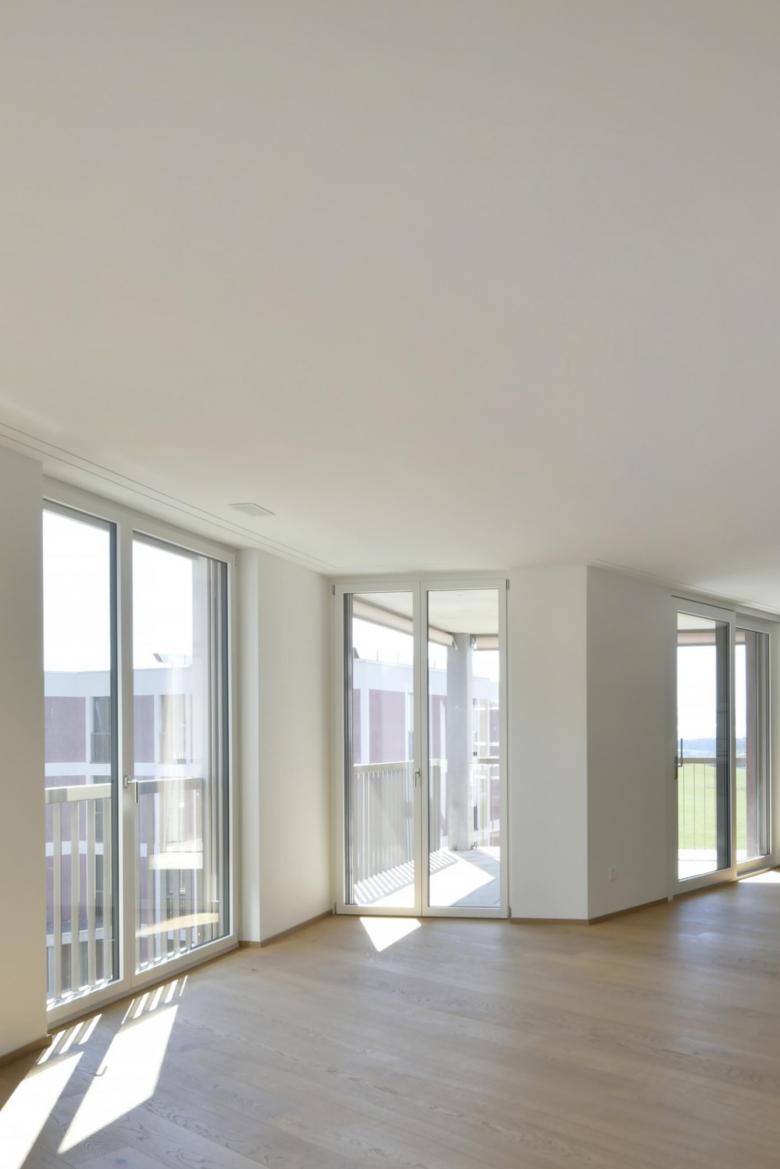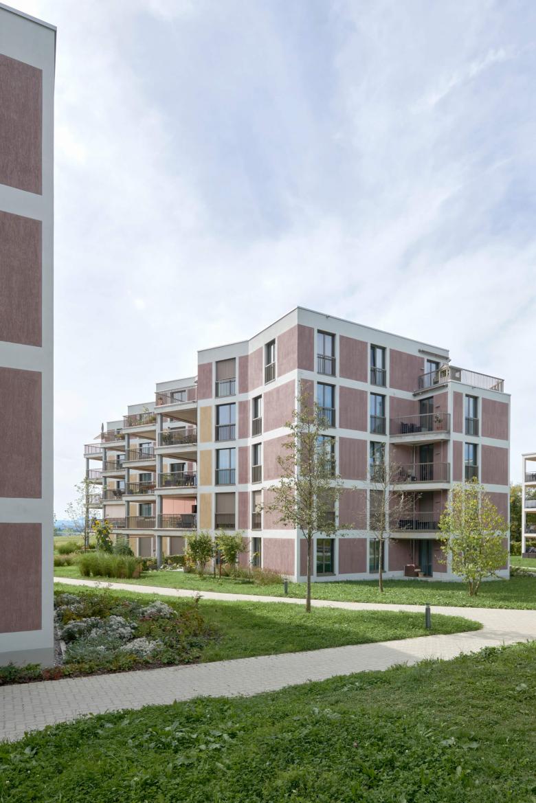 Die zueinander versetzten Punkthäuser weisen ebenfalls eine optimierte Ausrichtung und Besonnung auf. Auch das Haus in der zweiten Reihe profitiert vom starken Bezug in die Umgebung mit weiten Blickbezügen. Mehrheitlich weisen die Wohnungstypen einen grosszügigen Wohn-Essbereich auf, mit Ausnahme der Familienwohnungen, wo bewusst Wohnküchen und separate Wohnzimmer konzipiert werden. Nasszellen und Küchen sind in einem Kern zusammengefasst und lassen so viel Flexibilität für individuelle Einteilungen der Zimmer.