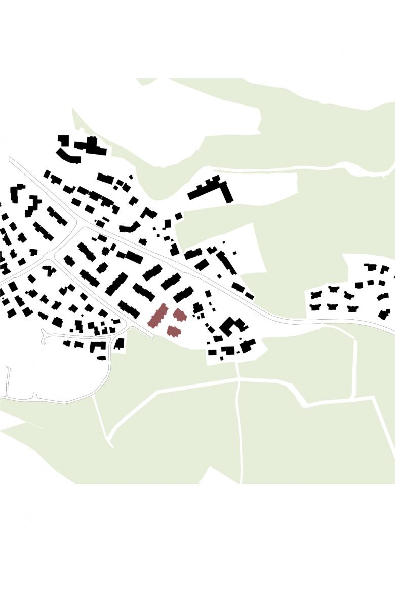 Mittels einer neuen Zeile findet die bestehende Siedlung ihren Abschluss und leitet mit zwei Punktbauten zum gewachsenen Dorfkern über. Dabei bestimmen unterschiedliche Blickbezüge und Sichtachsen die Position der Neubauten zueinander und zu den bestehenden Häusern. So fliesst der Grünraum vom Nordrand an der Tösstalstrasse bis zur Südgrenze durch. Eine Durchwegung der Gesamtanlage verbindet die Bauten und ermöglicht gemeinschaftliche Aufenthaltsbereiche im Aussenraum.