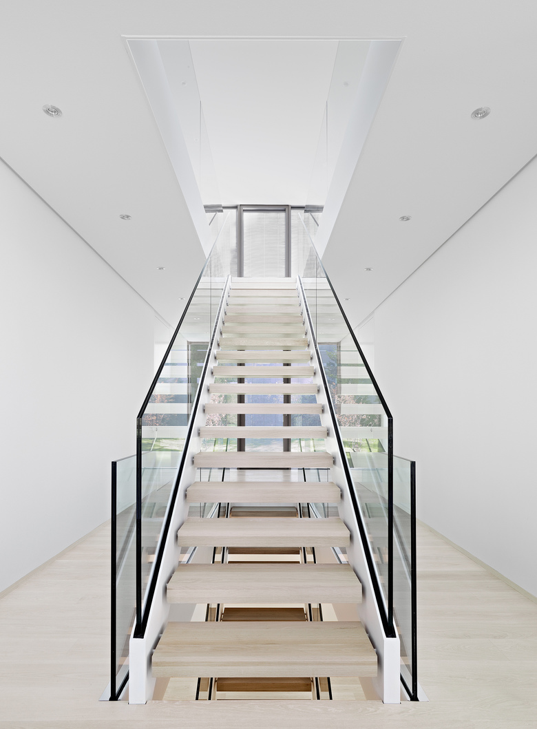 Das Innere des Wohnhauses ist durch eine klare Führung von Blick- und Bewegungsachsen bestimmt. Im Zentrum des Gebäudes befindet sich die Eingangshalle mit zentral gestellter Treppe.