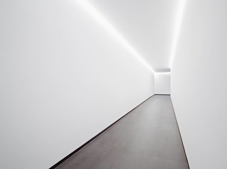 Seitlich zur Halle gelegen befinden sich die Wohnräume. Im Staffelgeschoss ist der Schlafbereich mit offenem Badezimmer und Ankleide untergebracht. Das Staffelgeschoss wird über eine separate halbgewendelte Treppe erschlossen, wodurch dieser Bereich als „Haus im Haus“ erlebt wird und eine hohe Intimität erhält. Auch im Inneren des Staffelgeschosses wird das Thema der spiegelnden Flächen konsequent weitergeführt. Durch vollflächige Verspiegelungen der Schrank- und Zimmertüren erscheinen die Räume großzügig und weit.