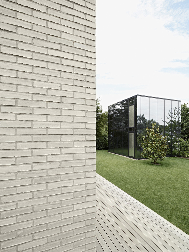 Das Wohnhaus hat eine Fassade aus gedämpften grauen Backsteinen, und der Pavillon ist vollflächig verspiegelt. Der markante Glaswürfel nimmt das wechselnde Licht des Himmels und seiner Umgebung auf. Je nach Blickwinkel, Tageszeit und Witterung verändert er seine Erscheinung, und seine Fassade reagiert auf ihre Umgebung. Ebenso wie das verspiegelte Staffelgeschoss auf dem Wohnhaus, welches durch Reflexion mit dem Himmel verschmilzt.