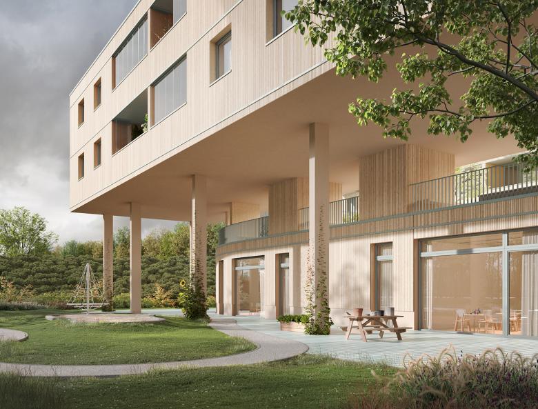 Durch die differenzierte Abstufung/Abfolge der Baukörper wird eine baulich/räumliche Trennung der Kindertagesstätten-Außenfläche zu den Wohnungen erzeugt, was zur Optimierung der gegenseitigen Verträglichkeit zwischen den unterschiedlichen Bereichen beiträgt (Kindertagesstätte und Wohnnutzung). Gleichzeitig wird durch die Fuge zwischen dem Dachgarten und dem südlichen Wohnriegel eine bessere Belichtung und Aussicht für den nördlichen Wohnriegel erreicht. Darüber hinaus wird das Erdgeschoss als eingeschossiger Baukörper wahrgenommen, die Kindertagesstätten-Nutzung wird nach außen hin ablesbar, und der Luftraum über der Terrasse öffnet sich nach Norden zum Dachgarten hin.