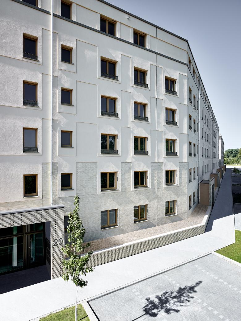 Die Gebäude haben einen klinkerverkleideten Sockel über zwei Geschosse und eine auf die jeweilige Klinkerfarbe abgestimmte helle Putzfassade. Die unterschiedlichen Gebäudefarben (Braun, Beige und Grau) erzeugen – bei prinzipieller Gleichheit der Gebäude – eine hohe Varianz und Adressbildung.