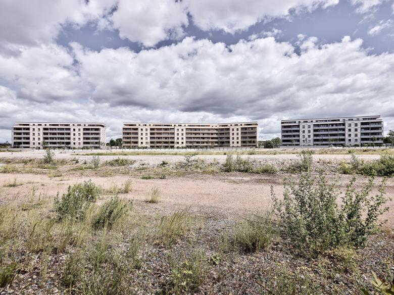 Das nördliche „Rückgrat“ des Quartiers bildet eine sechsgeschossige, geschlossene Bebauung, welche das Wohngebiet zur Bahntrasse und Kostheimer Landstraße abschirmt und eine klare Raumkante zur Quartiersstraße bildet. Hier entstehen in drei Baukörpern zusammengefasst acht Mehrfamilienhäuser mit 172 Wohneinheiten.
