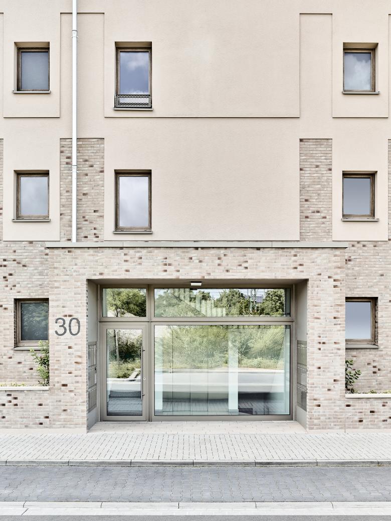 Eine an den Grundstücksgrenzen umlaufende 50 cm hohe Klinkermauer bildet ein Sockelpodest, wodurch eine Pufferzone zwischen Gebäude und Straße entsteht. Im Bereich der Eingänge greift die Mauer die Form des Putzreliefs auf, erzeugt ein Portal und betont dadurch die Hauseingänge.