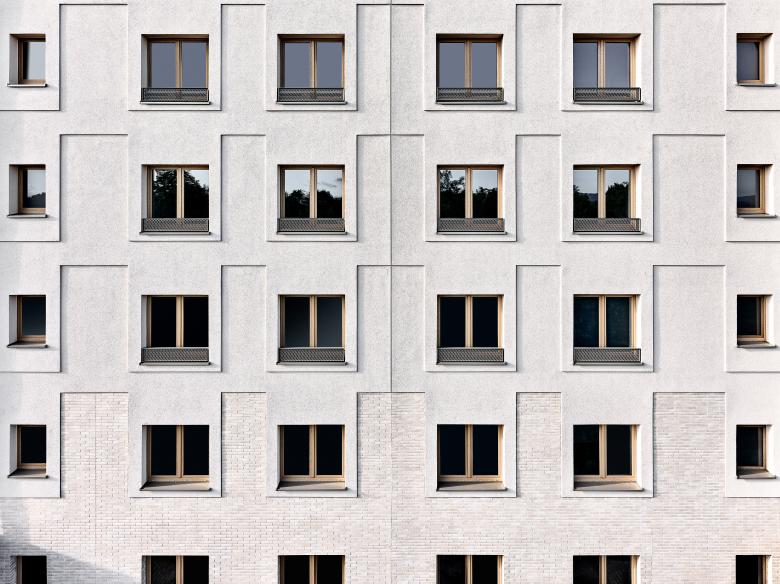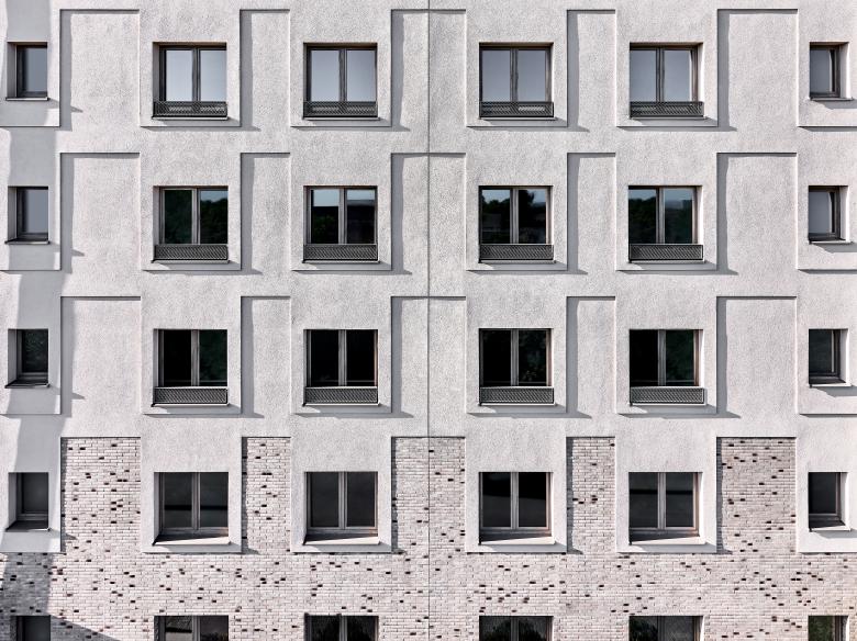 Um die typische Monotonie von Zeilenbauten aufzubrechen, wurde ein rhythmisiertes Putzrelief entwickelt. Durch die sich schuppenartig überlappenden Putzfaschen wird die Fassade horizontal und vertikal gegliedert und ein abwechslungsreiches Schattenspiel erzeugt. Die in der Höhe sich überlappenden Putzflächen vermeiden horizontale Vorsprünge, auf welchen sich Wasser sammeln und das Material angreifen kann. Die Form des Reliefs ergibt sich folglich aus den funktionalen Eigenschaften des Materials.