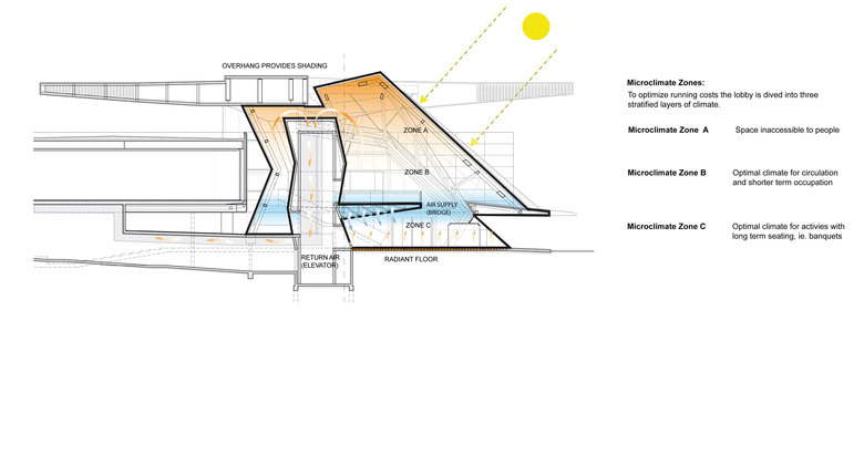 The Energy Concept – The energy necessary for lighting, heating and cooling the Crystal is minimizeed by strategic building massing and extensive daylighting. The mass and location of the Gallery Box and High Roof protect the southern oriented Crystal glazing from direct sunlight. At the same time the reflectivity of the façade material raises natural light levels in the Crystal and reduces the need to power artificial light sources. The Crystal utilizes microclimate zones as a heating and cooling concept. By eliminating the need to condition the entire air volume in the Crystal, and by focusing the energy used to condition the space in the areas where people are located, operating costs and energy use are significantly reduced. The floors of the Gallery Box and Crystal are composed of poured in place concrete slabs with water filled tubes that supply heating and cooling by changing temperature state of the massive floor slab. This radiant floor system is more efficient than simple forced air systems because it uses the mass of the concrete as a storage device which delivers a stable continuous source of heating and cooling.