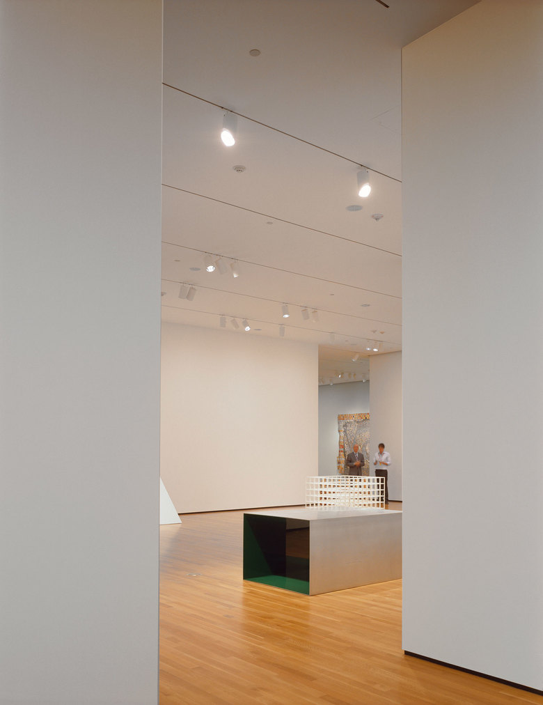 The interior of the Gallery Box is an expansive space which has very few columns and is therefore extremely flexible for varying exhibition requirements. A large freight elevator brings oversized works to and from the storage areas and serves as a link between the loading dock and Gallery Box. Natural light is eliminated in the galleries so that it can be strictly controlled and damage from sunlight can be eliminated.