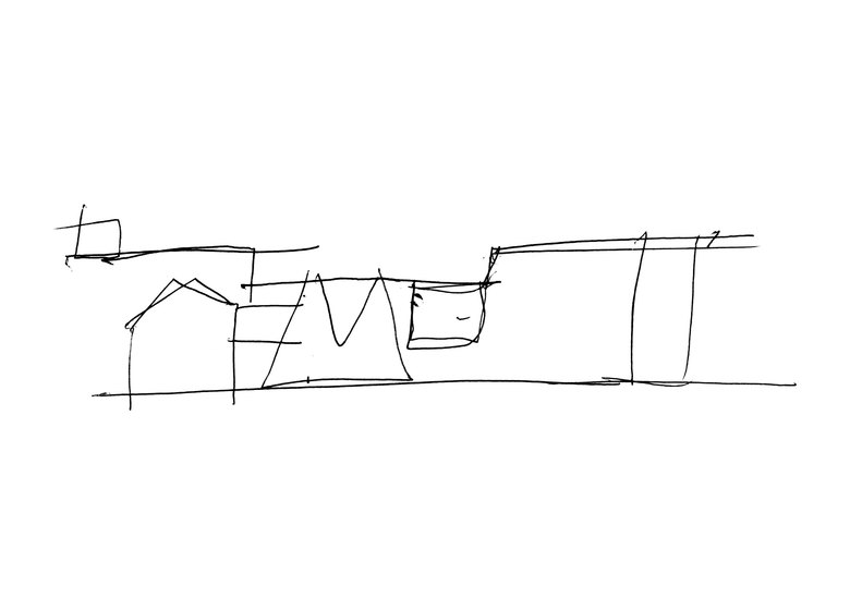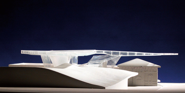 The Roof Cloud, which hovers above the building, creates a blurred envelope for the museum because of its sheer mass and materiality. It encloses interior space, provides shade for exterior spaces, and operates as a horizontal landmark in the city.