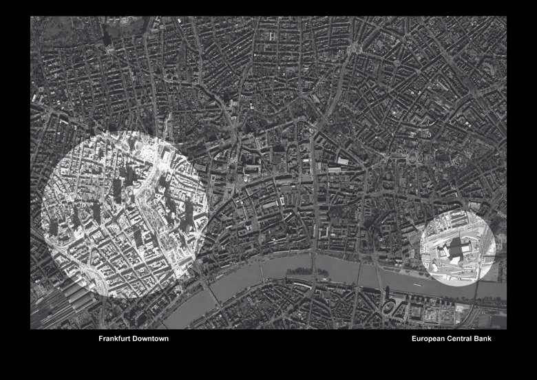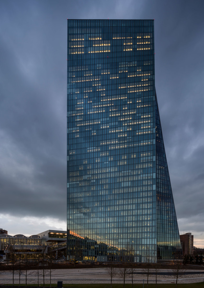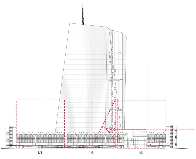 Der Entwurf des Wiener Architekturbüros Coop Himmelb(l)au für den Neubau der Europäischen Zentralbank in Frankfurt kombiniert den liegenden Hallenbau-körper der denkmalgeschützten Großmarkthalle mit einem rund 185 Meter hohen spektakulär verdrehten Doppel-Büroturm. Ein Eingangsbauwerk verbindet diese beiden Elemente zu einem Gebäudekomplex von besonderer städtebaulicher Bedeutung. Das turmhohe gläserne Atrium zwischen den zwei Bürotürmen schafft mit Brücken, Stegen und Plattformen eine vertikale Stadt mit Straßen und Plätzen. Die halböffentlichen und kommunikativen Funktionen sind in der ehemaligen Großmarkthalle untergebracht. Mit dem außergewöhnlichen Atrium und dem sichtbaren Stahltragwerk stellt das EZB Gebäude einen neuen Hochhaustypus dar.