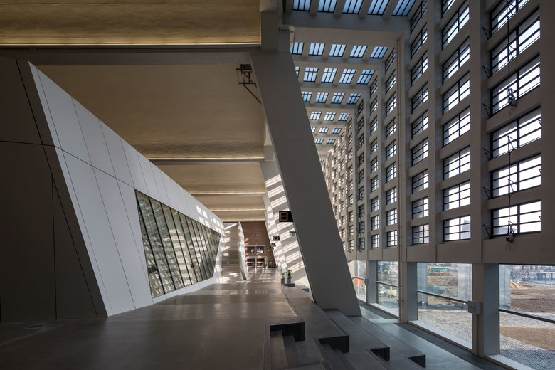 The Grossmarkthalle – the communicative forum – The existing landmarked Grossmarkthalle, a former wholesale market from the 1920s, is used as an “urban foyer”. The conference and visitor’s center, library and employee cafeteria are placed diagonally in the spacious interior of the hall as independent building structures (with a “house within a house” concept). A floating entrance building penetrates the hall structure from the outside. With its asymmetrical contours, slanted facades and generous windows it marks the representative access to the ECB. The lobby, two-story press conference room and a lecture room are located here. The so-called “loop” – a glass walkway between the highrise and the market hall – completes the ensemble.