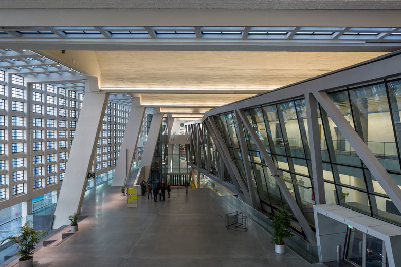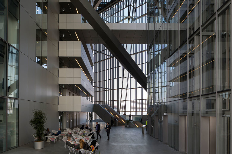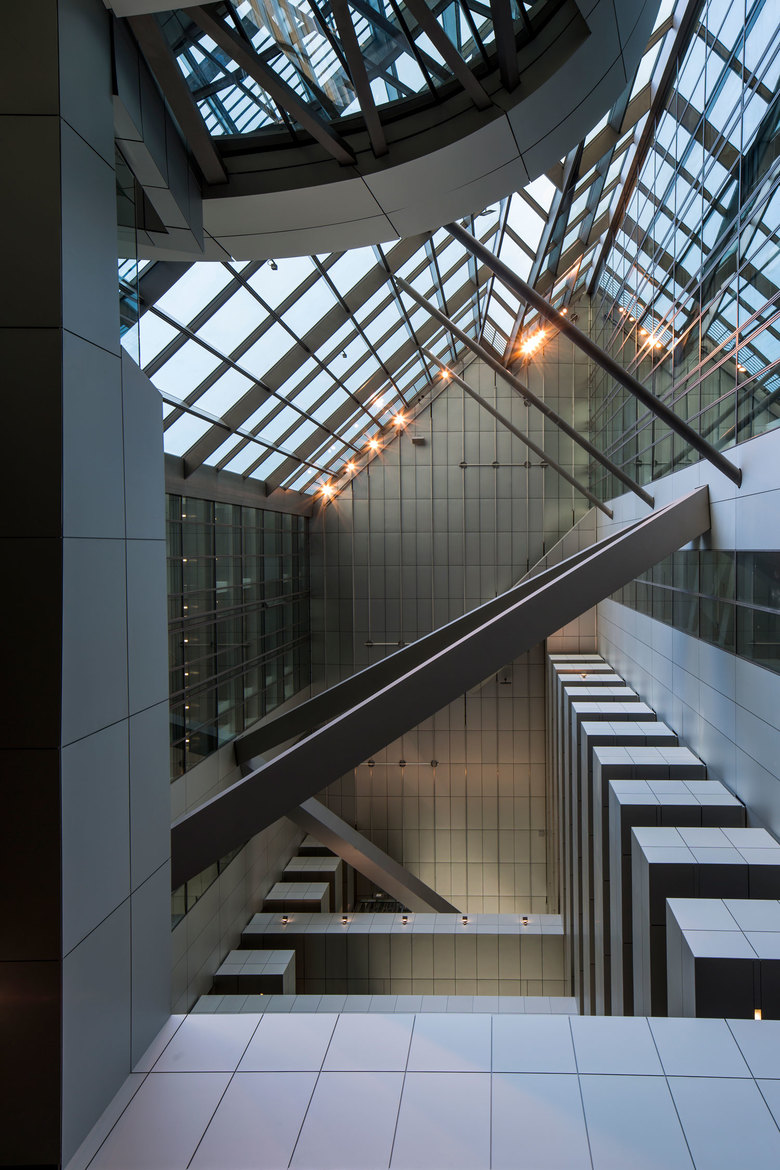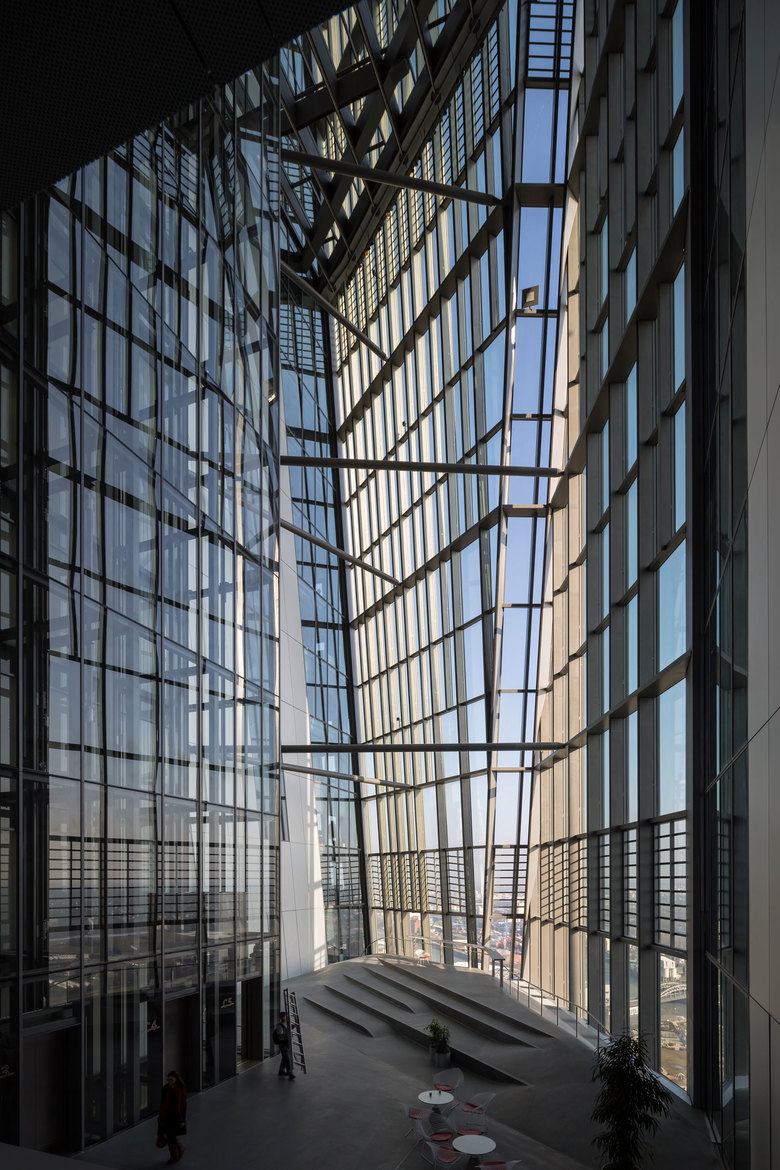 The design of the Viennese architectural studio Coop Himmelb(l)au for the new premises of the European Central Bank in Frankfurt combines the horizontal structure of the landmarked Grossmarkthalle with a twisted double tower, which rises to 185 meters. United by an entrance building, these two elements form an ensemble of special architectural significance. Featuring bridges, pathways and platforms, the glass atrium between the two highrises creates a vertical city. The semi-public and communicative functions are located in the former Grossmarkthalle. The exceptional atrium and visible steel support structure show that the ECB building belongs to an entirely new typologie of skyscrapers.
