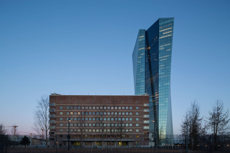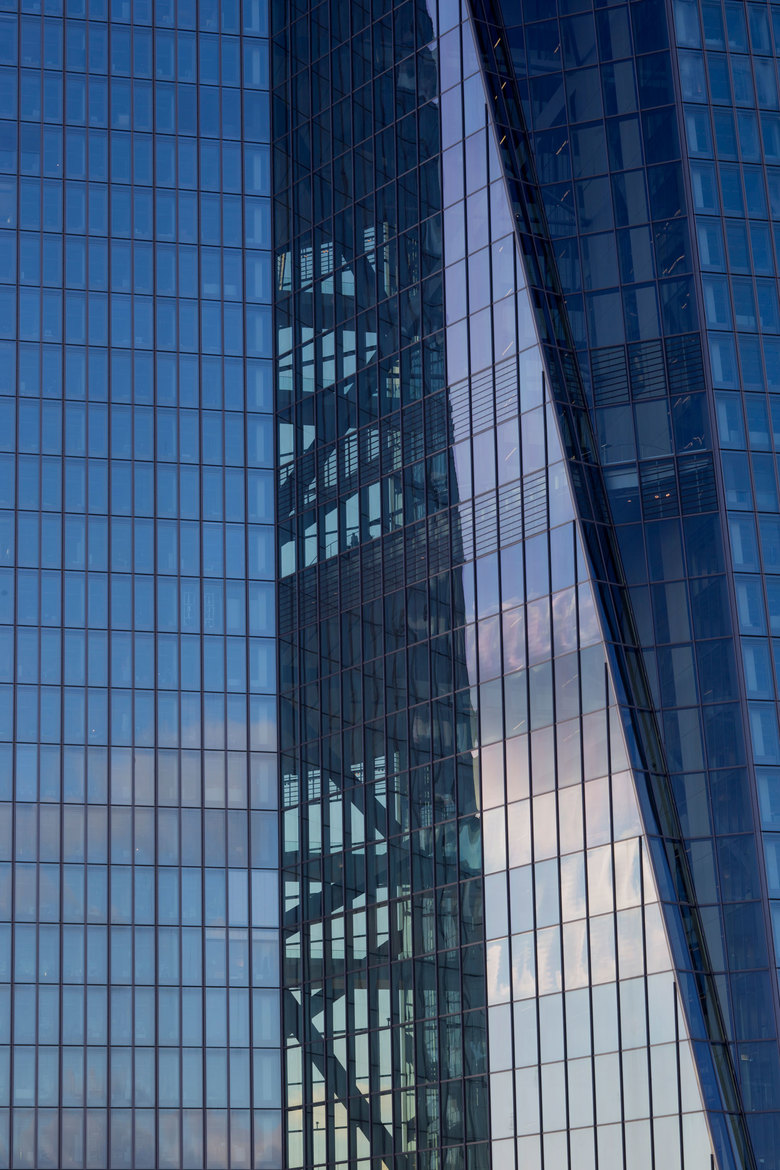 Urban construction and architecture – The ECB’s architecture was carefully attuned to its location in Frankfurt’s Ostend district. With its clear orientation towards the urban perspectives, the ensemble enters a dialogue with Frankfurt’s most important reference points: the Alte Oper, the Museum Embankment and the skyline of the financial district. The distinctive double tower can be seen from all of the important places in Frankfurt’s city center and from the Main river, creating an initial point for a second center in the East of Frankfurt.