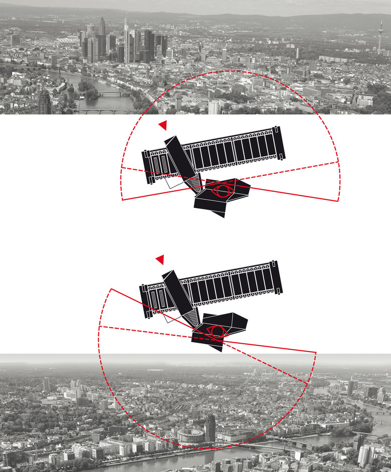 Städtebau und Architektur – Die Architektur der EZB wurde sehr sorgfältig auf den Standort im Frankfurter Ostend abgestimmt. Durch die klare Ausrichtung auf die städtebaulichen Sichtachsen tritt das Ensemble in Dialog mit den wichtigen Bezugspunkten Frankfurts: mit der Alten Oper, dem Museumsufer und der Skyline des Bankenviertels. Der markante Doppelturm ist von allen wichtigen Standorten der Frankfurter Innenstadt wie auch vom Main aus sichtbar und bildet den Ausgangspunkt für ein zweites Zentrum im Osten Frankfurts. „Das entspricht dem Prinzip der polyzentrischen Stadt, die wesentlich dynamischer ist, als die monozentrische Stadt“, erklärt Wolf D. Prix, Design Principal und CEO von Coop Himmelb(l)au. „Zwischen den Zentren entstehen Spannungsfelder, in denen neue Entwicklungen provoziert werden.“
