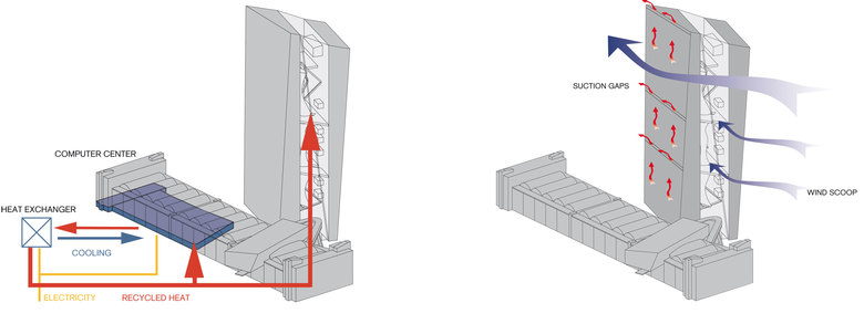The sustainable energy concept – Energy efficiency and sustainability were key factors in the competition. The energy concept includes the following measures: utilization of rain water, heat recovery, efficient insulation, sun protection and illumination as well as a natural ventilation for the offices. Some areas, such as the atrium and open zones of the Grossmarkthalle, are not equipped with an air conditioning system; instead they serve as a buffer zone between the interior and exterior climates. The "shield hybrid facade" of the office towers consists of three layers and offers a direct and natural ventilation of the offices via vertical, room-high ventilation elements.