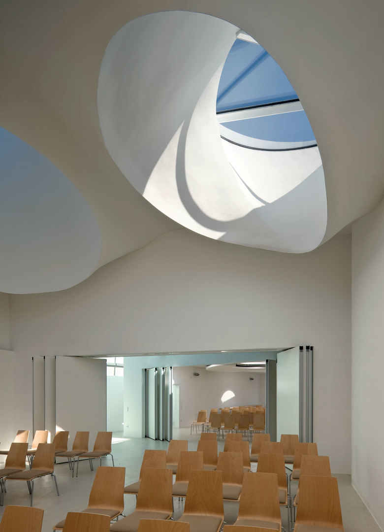 The play with light and transparency has a special place in this project. The light comes from above: three large winding openings in the roof guide it into the interior. The church interior itself is not only a place of mysticism and quietude but also an open space for the community.