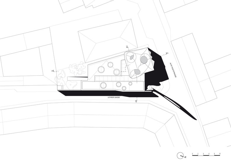 The roof with its striking three skylights is a key element of this building. The exterior skin is made of 8 mm thick three-dimensionally curved steel plates welded on a frame construction. The roof elements were constructed and manufactured with shipbuilding technologies. One important role model was Le Corbusier, for his references to shipbuilding, but also because of his La Tourette monastery.