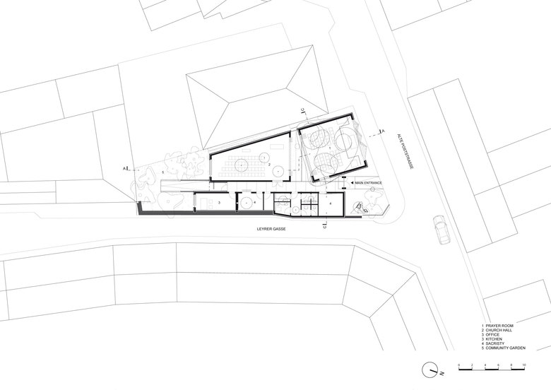 A longitudinal slab building along a small side alley flanks both main spaces and comprises the sacristy, the pastor’s office, a small kitchen and other ancillary rooms. A handicapped accessible ramp between the three building components accesses the church garden on higher ground.