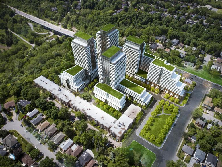 The current site is a complex of 10 interconnected 4-storey apartment blocks that were constructed in 1969 with 415 rental units. The surrounding area is primarily single detached dwellings while to the west is part of the Natural Heritage System that includes the Don River Valley and Earl Bales Park.
