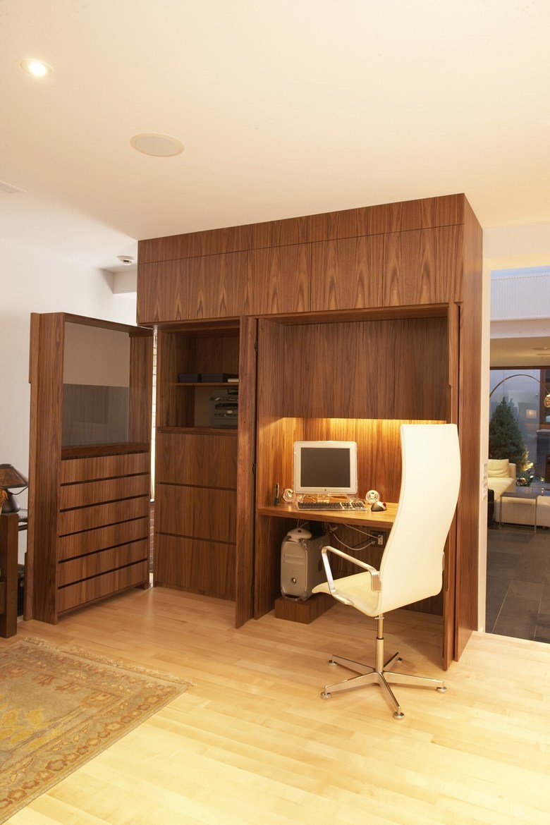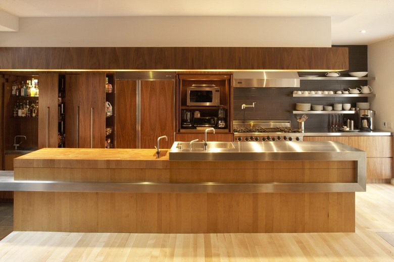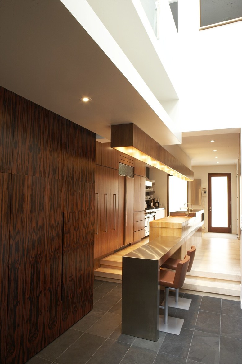 The 2,500 sq. ft. home is a marvel of contemporary living. A two- storey atrium space of the dining room opens up the house and allows for a spacious kitchen. A room that is to be well-used by the owners, details include an “appliance garage” and stainless steel counters with a built-in chopping block.