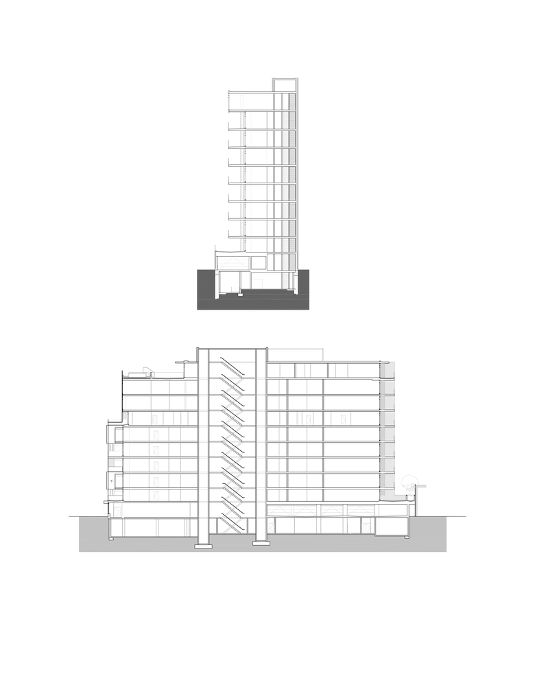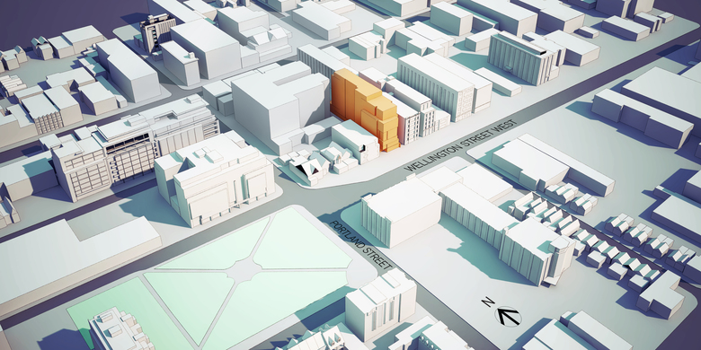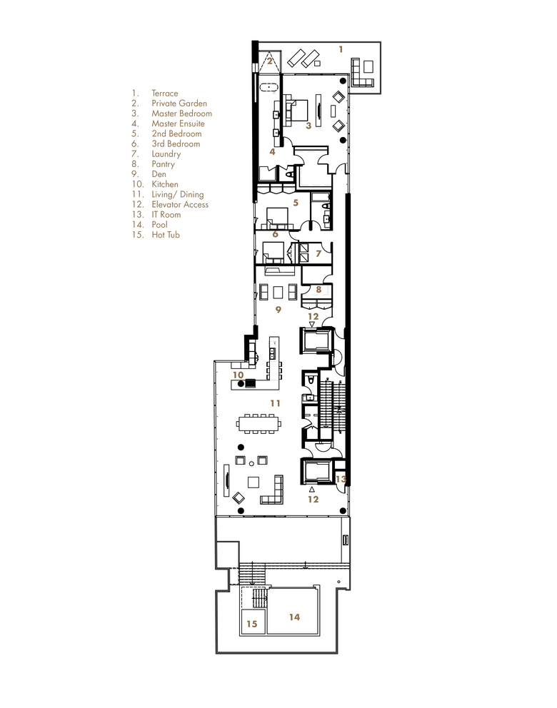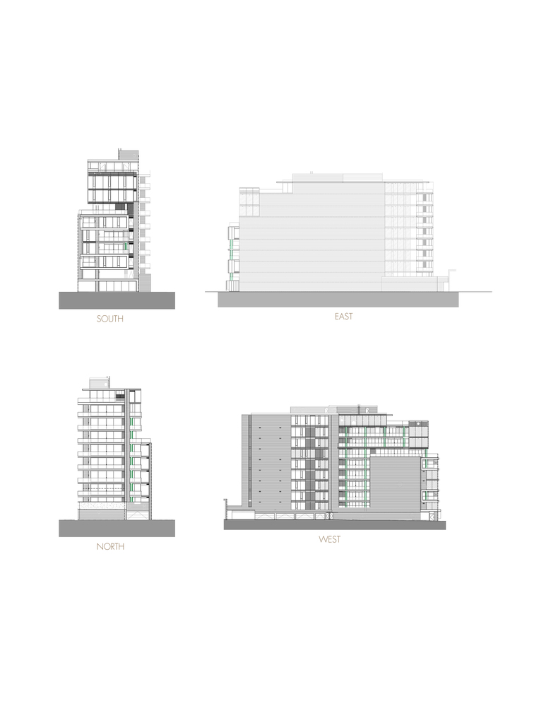 Conceived and designed to fill an high-end niche in the downtown King West District, these ultra-luxurious penthouse-sized loft suites provide for half-floor suites and full-floor units, each with a cabana terrace. Building features high-end finishes and kitchens, gas fireplaces, and additional terrace amenities and services. The challenge was to insert a very high quality, exclusive condominium on a narrow, long infill site in a predominately warehouse district. The 10 storey building contains only 17 suites, which are either half floor or full floor occupancy, served by separate elevators that enter directly into the suites. A major design directive was to provide substantial outdoor living spaces on terraces and decks, with floor to ceiling glazing where possible. The exterior materials palette was kept simple and elegant, the brick was a charcoal ironspot, the soffits were Ipe, black zinc was used as flashings and metal panel, balcony guardrails were frameless, tempered glass and the exterior glazing was flush, silicon glazed where applicable. The interior layouts, also prepared by the CORE, are spacious and uncluttered and emphasize the feeling of a “luxury of space”. The overall effect is a condo that engages the street with a playful facade on Wellington and that also fits in well with the massing and materials of the warehouse district.