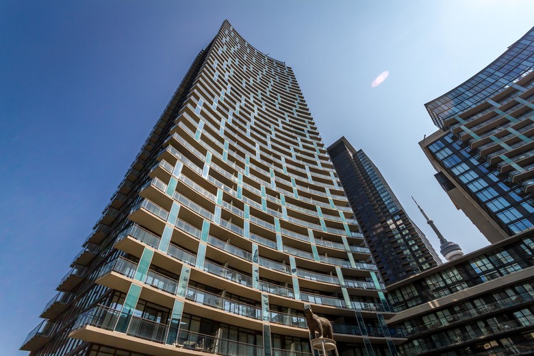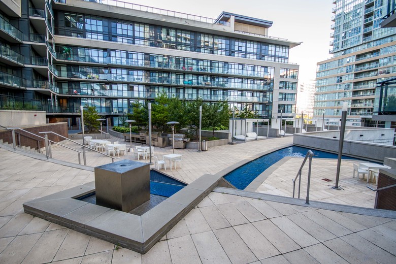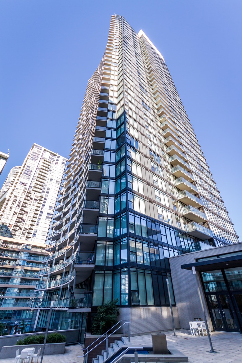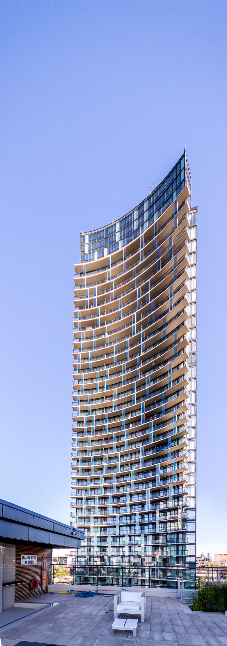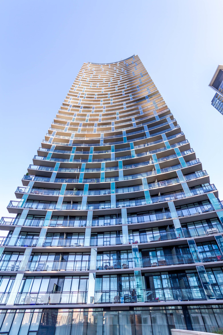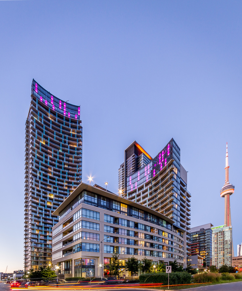 The Luna condominium is a 44-acre land development overlooking Toronto’s waterfront. This district is surrounded by bustling city and forms part of a magnificent iconic skyline that includes Toronto landmarks such as the CN Tower and the Rogers Centre. The site itself has a privileged location facing the main public space in the district, an eight-acre landscaped urban park known as CityPlace Central Park. The massing of the face to the park conforms to a subtle convex curve at the north edge of the site formed by the existing roadway. This crescent provides the regime for the geometry of the two towers on the site. A ribbon of balconies, forming visually prominent horizontal lines, provides presence for these two towers and contours the crescent. Random reflective glass panels on the exterior face of the balconies offer a three-dimensional textual pattern to the facade as well as acting like a mirror to the changing moods of the Toronto sky