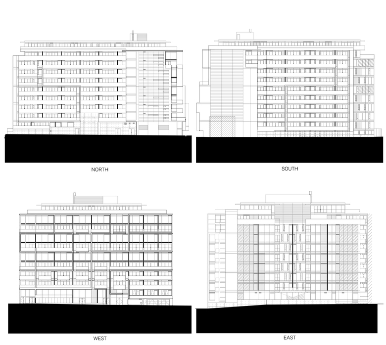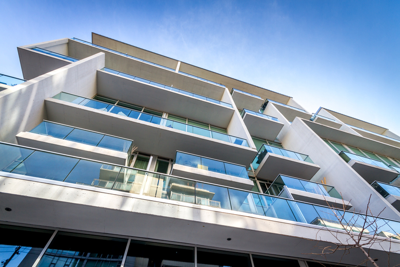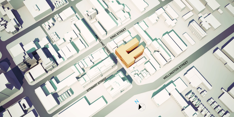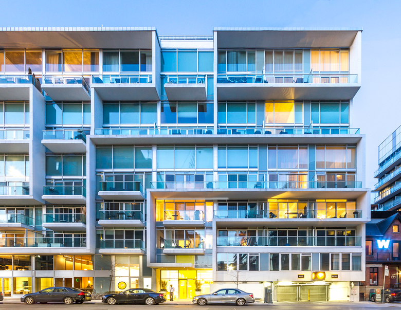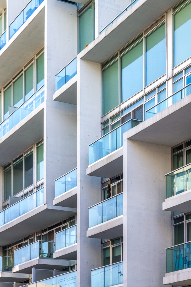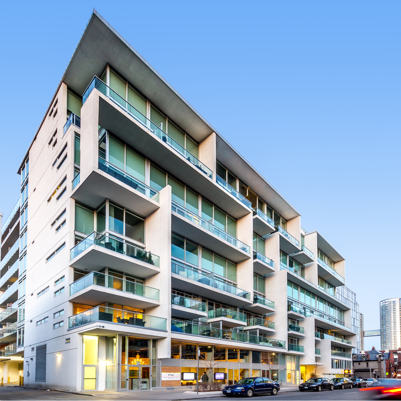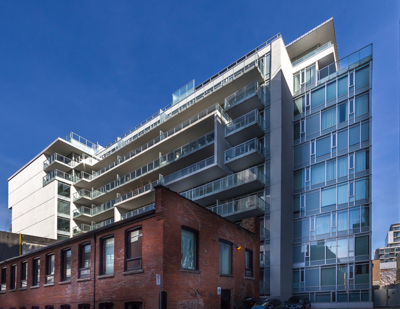 Seventy5 Portland was complete in January 2011 and is an innovative modern jewel embracing the indigenous culture of this lively Toronto neighbourhood. The developer wanted to create a unique statement with the building facade, which formed an anchor to the terminus of the street. The design distinguishes itself with its lively facade and glass-fronted, cantilevered balconies suspended intimately over the street. The building exterior features smooth concrete together with clear glazing in anodized aluminium frames. The building site plan was designed in a unique U-shape that embraces a serene courtyard and complements the Portland streetscape. The eleven storey structure is characterized by massed elements that shift in and out. This is accentuated by soaring 18’ concrete ceilings in two storey units, floor-to-ceiling glass, generous balconies and terraces, which give the structure a bold dramatic presence and allow for an open-air lifestyle in a bustling setting. The projecting concrete fins also serve to frame neighbourhood views and give the exterior balconies a sense of enclosure. A flash of yellow, the only concession to colour, is emblazoned over the front entrance and repeated again within the front entrance hall. Concrete was the perfect material to express the complexity of the façade of our project. We needed a material that would be both structural and architectural while at the same time lending an elegance to the composition.