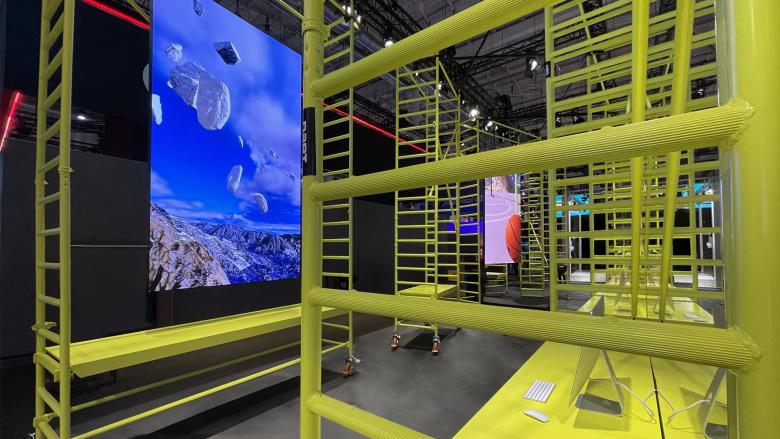 Simpel und stark – wenige Elemente wie neonfarbene Gerüste und LED-Screens prägen das Standdesign. Eine über die Gesamtlänge angebrachte Spiegelwand erscheint erst bei genauerem Hinsehen als vollständige Spiegelung des Stands – insbesondere die gespiegelten Gerüste erzeugen die perfekte Illusion einer Erweiterung des Raumes.