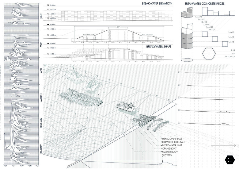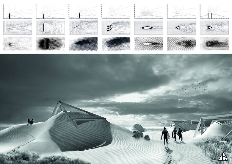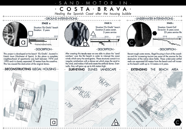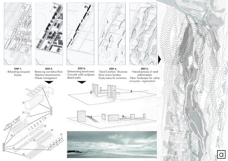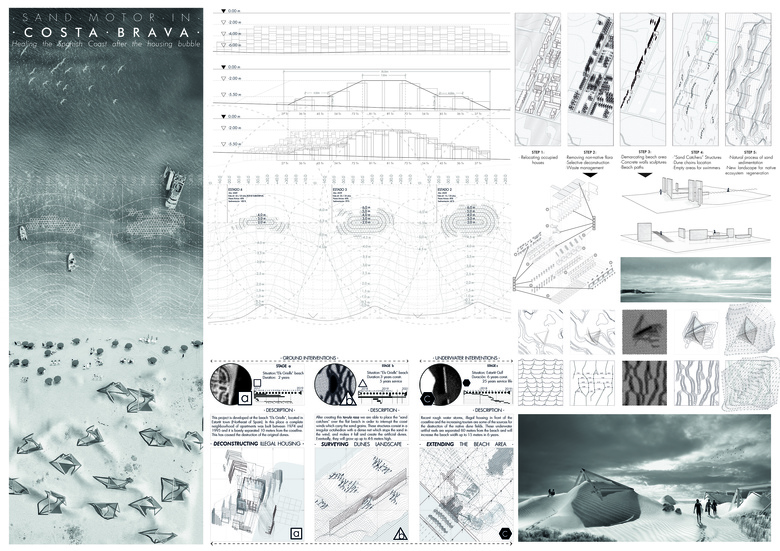 "During the Spanish housing bubble, the 30% of the beachfront was urbanised. This project is a manual to regenerate these lost landscapes: starting from deconstruction, up to the aerodynamic design of sand catcher devices, it aims to build a coexistence space between tourism and nature"