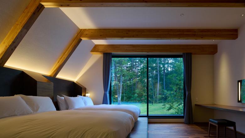 Die Innenräume bieten einen Luxus, der ganz und gar nicht glamourös oder gar aufdringlich wirkt. Es wird eher ein Erlebnis von natürlichen Materialien und Formen geboten, das ein entspanntes Gefühl von „Daheim“ anstatt „Hotel“ sowie einen Hauch von japanischen Wabi-Sabi vermittelt.
