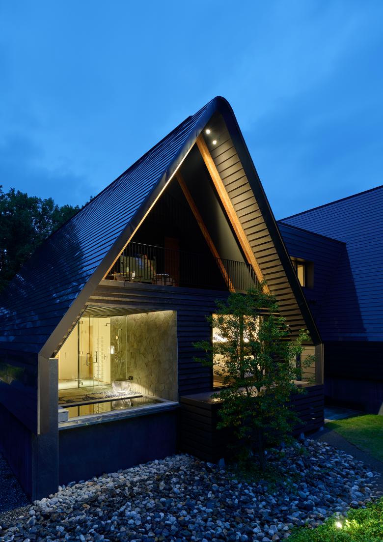 Der dreiteilige Gebäudekomplex nimmt die Bergsilhouette der dominierenden drei Berge Yarigatake, Shakushidake und Shiroumadake auf und orientiert sich an der klimatisch bedingten regionalen Bauweise mit steilen Dächern, um den hohen Schneelagen zu trotzen. Durch die Transparenz der Fassade und die Ausblicke wird die umliegende Natur wahrnehmbarer Bestandteil der Räume. Das Licht unterstützt diese Transparenz, verbindet Innen- und Außenraum und macht Struktur, Farbe und Form der natürlichen Materialien spürbar: Holz und Teppei-Stein aus der Region.