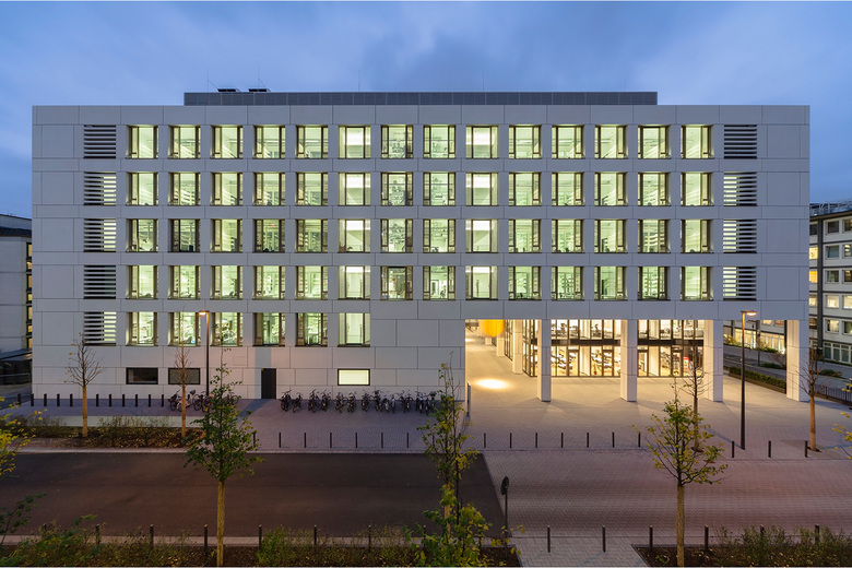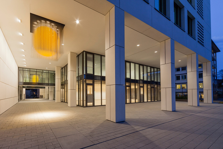 Die Lichtgestaltung bezieht sich auf den groß dimensionierten Gebäudedurchgang sowie auf die beiden Teile der Eingangshalle und schafft es, durch die intensiven Wandaufhellungen die Transparenz der Foyer-Verglasungen zu erhalten und somit den geteilten Raum als Ganzes erfahrbar zu machen.